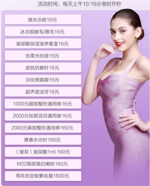 玩转娃娃机游戏的同时,还可参与整点秒杀活动!活动时间为4月20日—5月20日的上午十点十六分,秒杀专场包括1000元眼部整形通用券16元、青春水光针160元、m22面部美白嫩肤160元、脱腋毛/唇毛16元、周年庆定制素妆眉1600元等美容项目,每项仅限前30名爱美人士,快来成为那30名幸运儿里的其中之一吧!