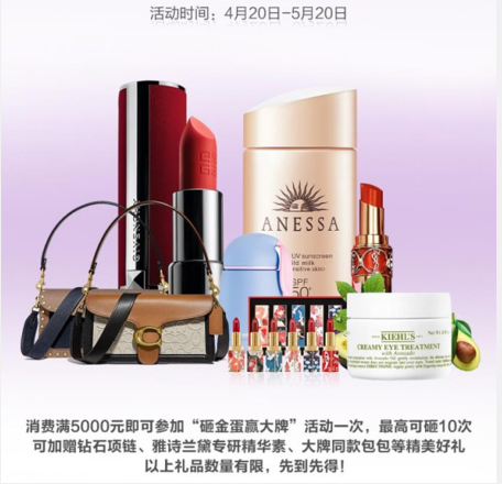 4月20日—5月20日,凡是消费满5000元的爱美人士便可获得一次砸金蛋的机会,最高可砸10次,并加赠钻石项链、雅诗兰黛精华素、大牌同款包包等精美好礼!