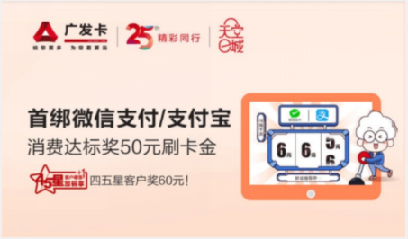 中国银联日前发布的《2019移动互联网支付安全大调查报告》指出2019年移动支付用户使用频次继续上升,日均使用超过3次。作为国内首批发展移动支付业务的金融机构,广发信用卡一直在积极促进推广移动支付普及便民,近期再度推出移动支付福利活动。活动期间,广发信用卡用户绑定微信或者支付宝就有机会获得最高60元刷卡金。