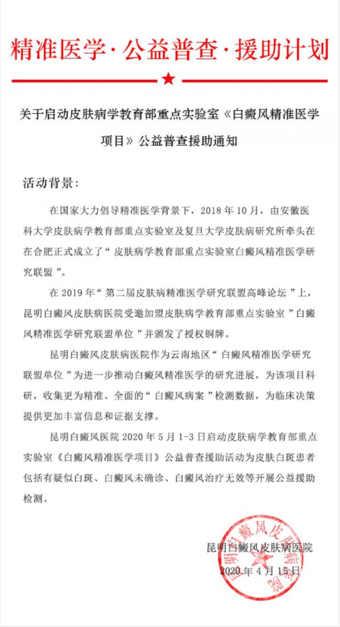 昆明白癜风皮肤病医院(护国路2号)作为云南首家"白癜风精准医学研究联盟单位"为进一步推动白癜风精准医学的研究进展,为该项目科研,收集更为精准、全面的"白癜风病案"检测数据,为临床决策提供更加丰富信息和证据支撑。决定于2020年5月1日-3日启动"皮肤病学教育部重点实验室《白癜风精准医学项目》公益普查援助活动"开展公益援助检测。