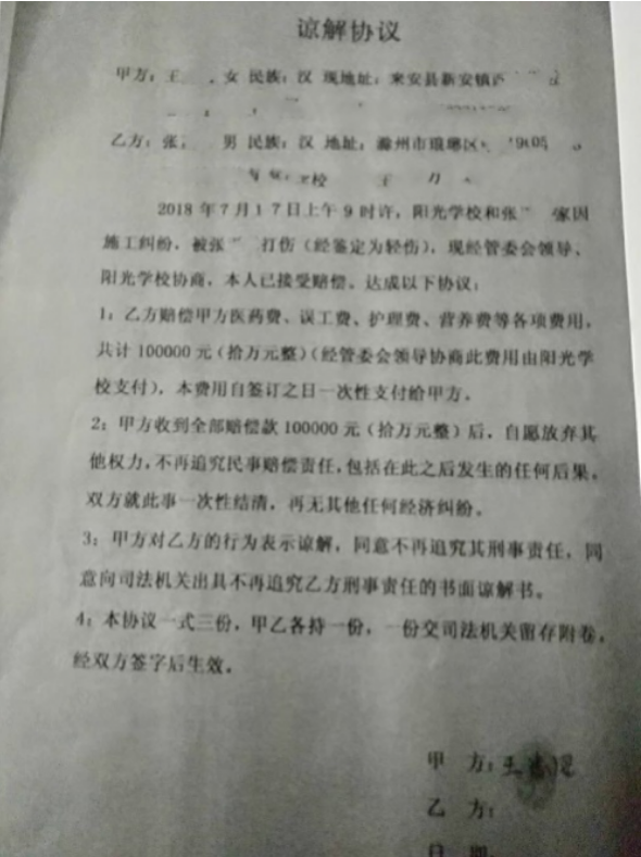 原文内容为:2018年7月17日上午9时许,阳光学校和张某某家因施工纠纷,被张某某打伤(经鉴定为轻伤),现经管委会领导和阳光学校协商,本人已接受赔偿,达成以下协议1:乙方赔偿甲方医药费、误工费、护理费、背养费等各项费用,共计100000元(拾万元整)(经管委会领导协商此费用由阳光学校支付),本费用自签订之日一次性支付给甲方2:甲方收到全部赔偿款10000元(拾万元整)后,自愿放弃其他权力,不再追究民事赔偿责任,包括在此之后发生的任何后果。双方就此事一次性结清,再无其他任何经济纠纷。3:甲方对乙方的行为表示谅解,同意不再追究其刑事责任,同意向司法机关出具不再追究乙方刑事责任的书面谅解书。