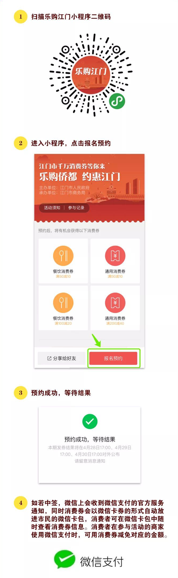 即日起,在微信支付实名认证的市民或来江门的游客,均可通过公众号或小程序登记摇号,中券的消费者可前往线下参与活动的商户处,在最终支付环节通过微信支付自动抵扣使用。