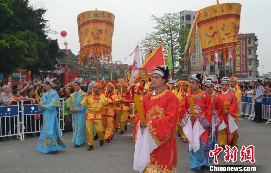 记者在现场看到,大巡游经过道路两旁,一早就挤满了民众,现场洋溢着欢乐的节日气氛。大巡游汇聚了祈福、粤曲、婚俗等多种当地特色方阵,生动再现中国传统民俗。