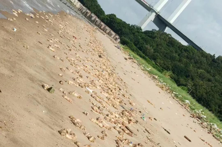 “发现猪脚和内脏的海岸有近一公里长,目测有几十吨”。虎门市水务局相关负责人李先生说。