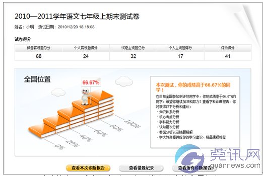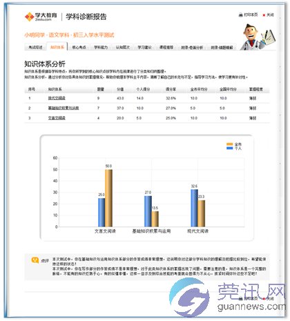 学大教育相关负责人告诉记者,从2010年12月30日起,广大学生只要登录学大教育官方网站或者直接访问即能参与免费测评,做完单学科或者全学科的测评试卷、填写基本的个人信息就能获得一份属于自己的专业、权威的个性化学科全面诊断报告。报告中不仅包括测评分数、每一道题的正确解答、解题思路分析,还能给出更深层次的考试分析、挖掘各知识模块的内在联系,从宏观上解读学生的知识掌握状况,系统解读学生的学科优劣势,提出个性化的学习指导建议;除此之外,学生还可以通过报告找到自己在同类学生的群体排名,从而了解自身的学习竞争力。