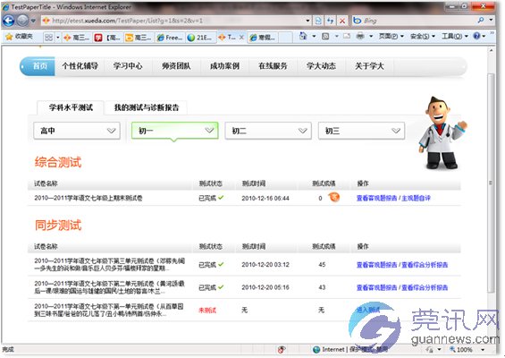 在继推出PPTS个性化辅导测评系统之后,2011年伊始,刚刚完成在美国纽交所上市的学大教育(NYSE:XUE)又推出一套在中小学课外辅导领域领先的“学大教育在线学科测评”系统。该系统由全国著名特级教师、高考试卷评价课题专家组成员、国家中高考资深教研员、教育部全国中小学教材审定委员会学科委员、考试中心学科编委等中高考专家组成的团队研发而成。测试中所有的题目设置全都依照教学大纲及考试说明的要求,真实反映学生在考试方面的强弱项;测评结果报告可以帮助学生制定详细、有针对性的个性化学习解决方案。