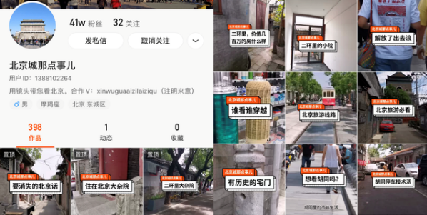 “朋友们好,今天我带您看看北京最窄的胡同。”地道的京腔,沉稳温厚的音色,流畅的镜头拼接和精致的构图,每条视频时长一分钟左右,除了对景点的介绍,还饱含着自己的思考。