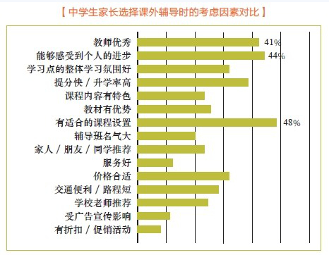 《中国基础教育研究问卷调查》结果显示,家长对辅导机构的评价相对间接,因此缺少特别突出的关注点。相对而言,对课程设置安排、看到孩子的进步和教师水平方面关注较高。