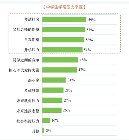 《中国基础教育研究问卷调查》结果显示,考试排名、父母老师的期望、自我期望以及升学压力是学生压力的主要来源,一半以上的学生均深有体会。