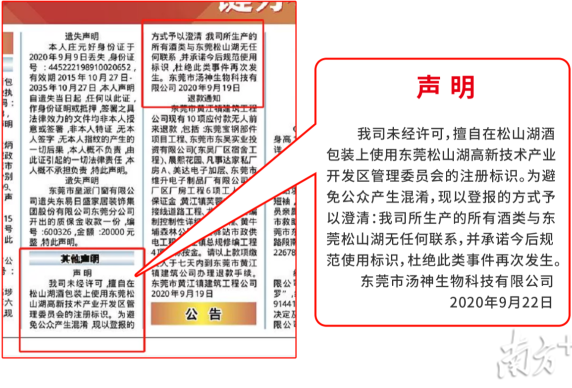 9月23日,松山湖管委会发布声明称,东莞市汤神生物科技有限公司侵犯松山湖管委会版权,在生产的“松山湖酒”外包装上擅自使用管委会标识。9月19日,汤神公司在本地媒体上登报澄清,“松山湖酒”与“松山湖管委会”无关系。
