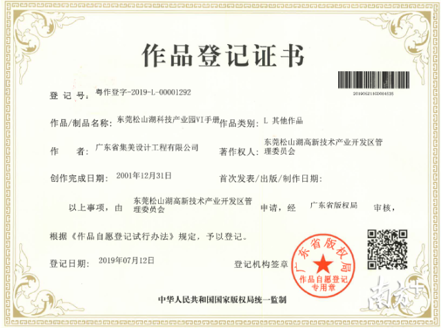 2001年,管委会委托广东集美设计公司设计制作了代表松山湖形象的系列标识,2019年7月获得广东省版权局申请版权登记颁发的松山湖形象系统(VI手册)的权属登记证书。