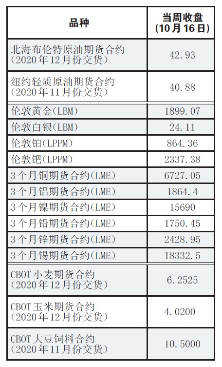 截至10月16日收盘,纽约商品交易所11月交货的轻质原油期货价格下跌0.08美元,收于每桶40.88美元,跌幅为0.20%;12月交货的伦敦布伦特原油期货价格下跌0.23美元,收于每桶42.93美元,跌幅为0.53%。