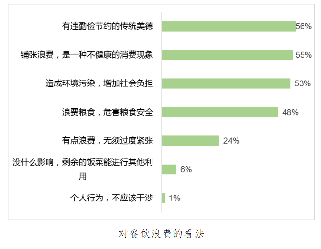 认知态度方面,消费者普遍对餐饮浪费持批判态度,超过半数的受访者认为其有违勤俭节约的传统美德,是一种不健康消费现象,而且会造成生活垃圾污染,增加社会负担。近半数的受访者认为餐饮浪费会危害粮食安全。