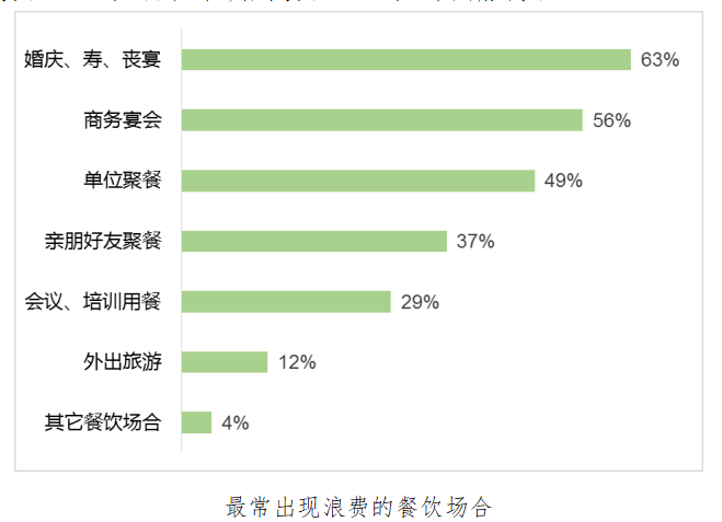 报告显示,包括婚宴、寿宴、丧宴等宴席是餐饮浪费的重灾区,有高达63%的受访者直指此处浪费高发。另外有56%的受访者认为商务宴会的浪费也很突出。除此之外,单位聚餐、亲朋好友聚餐、会议培训用餐也常见浪费。