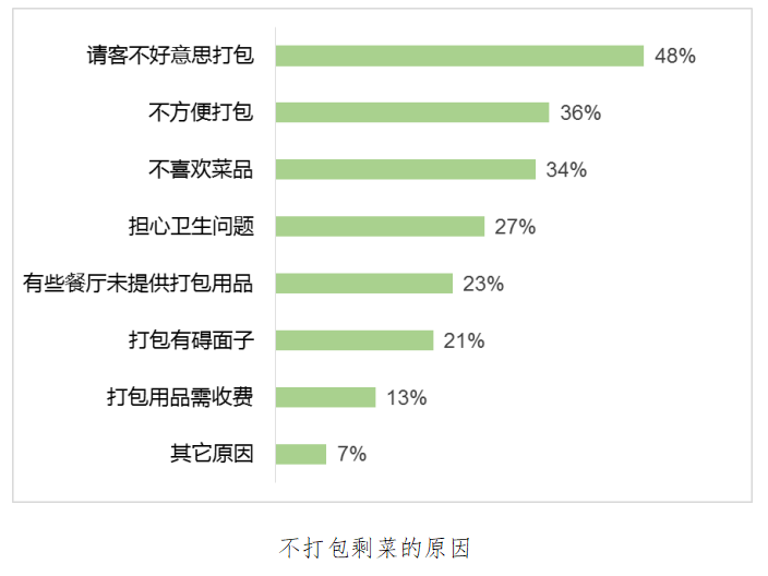 那么,在婚宴、寿宴、商务宴会中,为什么有这么多剩菜却不打包呢?对此,近半数受访者表示,是顾于情面不好意思打包。还有部分受访者表示,之所以不打包是因为不方便打包、不喜欢菜品、担心卫生问题、餐厅未提供打包用品。