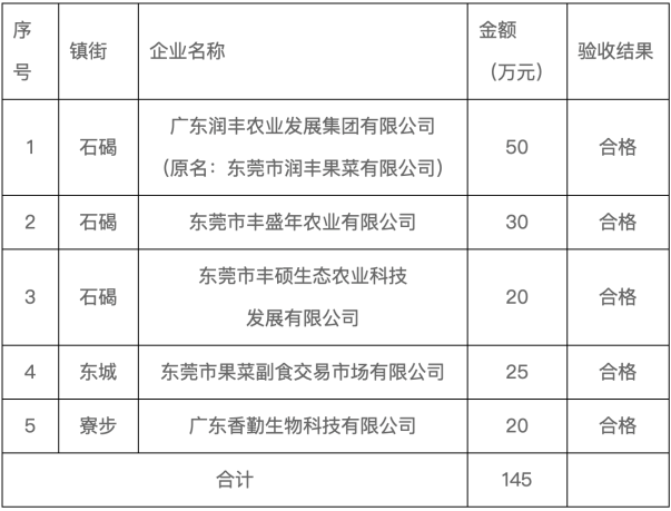 11月3日,记者从东莞市农业农村网获悉,东莞5家农业企业验收合格获培育创建粤港澳大湾区“信誉农场”专项资金共计145万元。这5家企业分别是广东润丰农业发展集团有限公司、东莞市丰盛年农业有限公司、东莞市丰硕生态农业科技发展有限公司、东莞市果菜副食交易市场有限公司以及广东香勤生物科技有限公司。