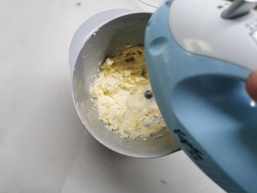 橙子煮好后捞出,用厨房纸吸干水分,放置一旁备用便可进行下一个步骤了。黄油室温软化后加入20克细砂糖,用电动打蛋器打发至发白,分次将40克全蛋液倒入,继续打发,打发至完全融合。