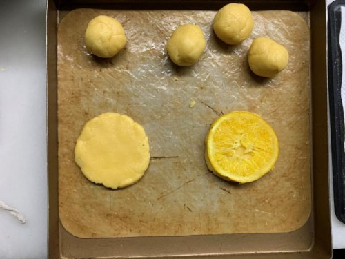在打发好的黄油里,分别筛入奶粉、泡打粉、低筋面粉,之后搅拌成团。然后将面粉分成30克的小团,按扁,与橙子片大小一致,然后再放上一片橙子。放入提前预热好的烤箱,上下火170度烤20分钟。