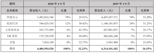 而作为利亚德“动刀”的主要部位,继2019年因夜游经济收入受到政策影响及未来几年该板块业绩存在的不确定性计提商誉减值3.36 亿元后,2020年利亚德对这一业务的压缩仍在继续。数据显示,今年前三季度利亚德夜游经济营收5.44亿元,较去年同期的11.40亿元腰斩,同时占营收的比重也由18%降至12%。另据利亚德方面透露,未来其夜游经济板块将保持在10亿左右的规模,但从前三季度的表现来看,2020年其恐已很难实现这一预期,而其规模过快的下滑对利亚德整体业绩造成的影响也正在显现。