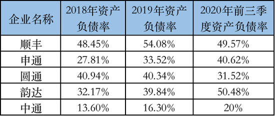 价格战之下,快递企业的负债率也普遍呈现走高趋势,除了圆通之外,通达系其他三家企业和顺丰的资产负债率在近年来均有一定程度上涨。