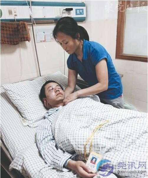 王某妮在医院照顾被鞋厂保安打伤的丈夫 本报记者 柯兵摄