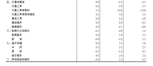 其他七大类价格环比三涨两平两降。其中,交通和通信、居住、生活用品及服务价格分别上涨0.9%、0.1%和0.1%;衣着、医疗保健价格均持平;其他用品和服务、教育文化和娱乐价格分别下降0.4%和0.1%。
