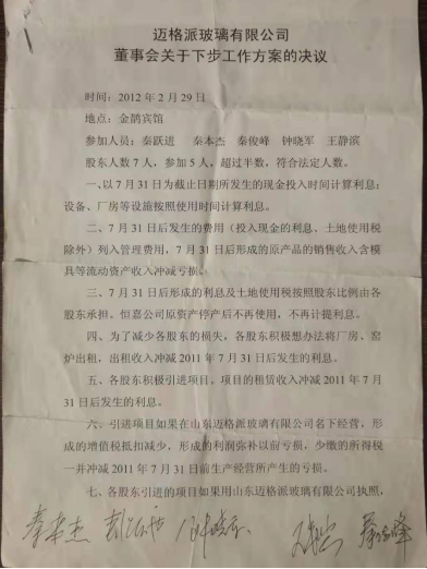 迈格派进入停产状态几个月后,于2012年2月29日再次召开董事会,对公司下一步的工作做出决议。此决议可以看出,自秦跃进向迈格派投资三千万元开始,所有的投资变成了借款,并向出借方支付利息。按照秦跃进所表达的意思,我们没有经营好,我们作为公司的股东,大家一定要想办法把公司继续经营下去,在秦跃进的说教下,各股东在董事会决议签署了自己名字。