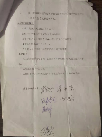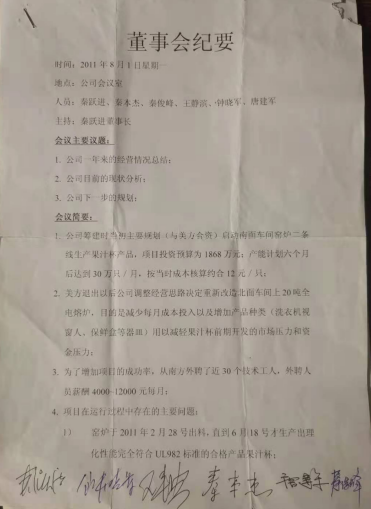 2011年,秦跃进开始主持迈格派公司全面工作,在仅五个月后,迈格派进入单方面停产。从董事会纪要可以看出,自2011年2月28日出料,直到6月18日才生产出符合标准的产品,另外因玻璃液材质等原因无法按照计划生产出其他产品。此次董事会会议的决议就是停产维修、员工放假。