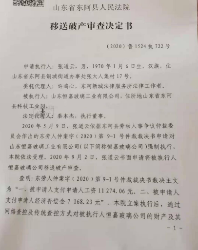 与此同时,秦跃进利用工人张道云,以迈格派公司欠其工资11274元为由,书面申请恒嘉玻璃破产。与此同时,秦跃进扬言称:“在东阿整个辖区包括聊城相关部门、单位都是我的关系,我的亲戚、我的哥们,。我让你打官司上告无门,必须让你净身出户,还得让你给我钱。包括你们现在用的场地、设施也得给我租赁费,如果不顺从我,就让工人起诉你们拖欠工资,让法院执行你”。