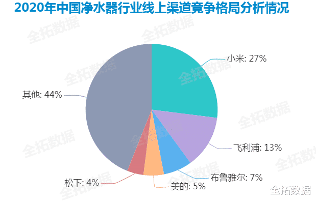 在线上渠道上,小米凭借价格优势,市占率高达27%,跻身线上渠道龙头老大,排名第二的飞利浦,其市占率不足小米的二分之一。通过对比2019年中国净水器线下及线上渠道竞争格局可知,相对而言,国产品牌的竞争优势主要体现在线上渠道。