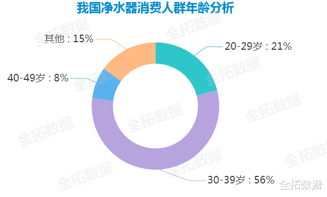 在一二线城市,消费者对净水器的认知度达到了62%,其中45%的消费者在未来一年内有购买净水器的意向,从品牌的角度来看,国产品牌都有提升。从消费人群年龄来看,净水器消费群体集中在30-39岁人群,比例高达56%,其次为20-29岁消费群体,占总数的21%。