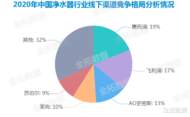 我国净水器行业品牌众多,主要是由惠而浦、飞利浦、AO史密斯等为代表的外资品牌和以小米、美的为代表的内资品牌构成。2019年,在线下渠道上,惠而浦市占率达到了19%,其次是飞利浦,其市占率为17%,AO史密斯以13%的市占率位列行业第三。