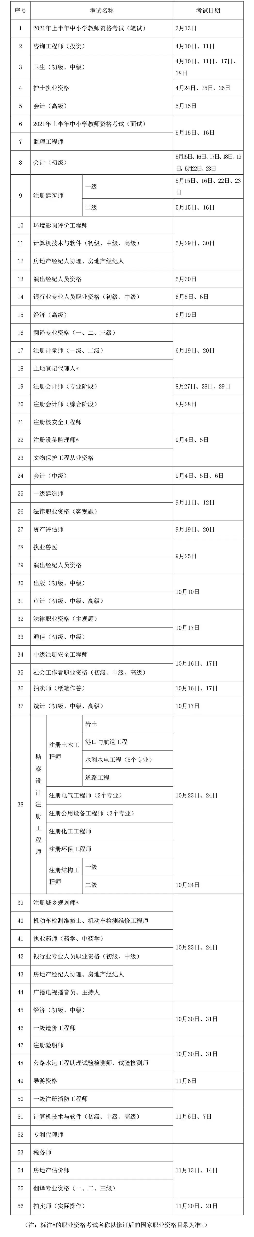 2021职业资格考试时间公布 2021-01-27 09:04:15 莞讯网 26日,人社部办公厅公布《关于2021年度专业技术人员职业资格考试工作计划及有关事项的通知》,要求各单位按照《2021年度专业技术人员职业资格考试工作计划》做好各项考试组织实施工作。需要注意的是,2021年下半年中小学教师资格考试日期由主管部门另行通知;专业技术人员计算机应用能力考试日期由各地自行确定。(来源:人社部网站) 上一篇:湖南中级职称评审和职称考试,找长沙汇德教育! 下一篇:没有了 返回首页