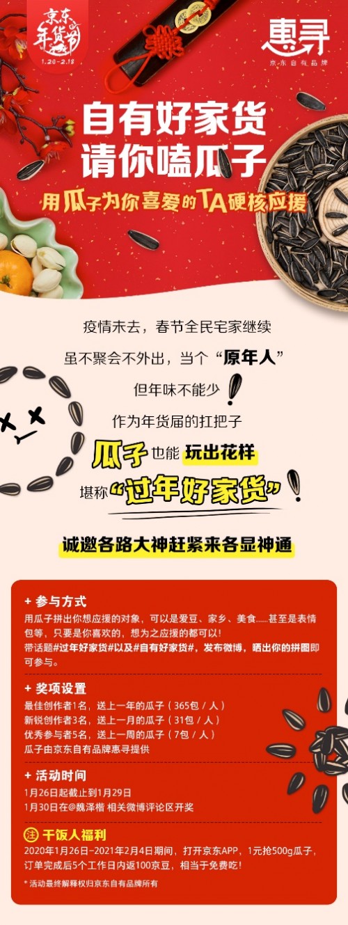 瓜子,这个年货界的扛把子,成了网友宅家过年自有乐趣的神器。而除了这次拼图活动,京东年货节期间,从1月26日至2月4日有800万袋瓜子限时抢,惠寻也参与其中。消费者只需支付1元钱,抢到后5个工作日内返100京豆,可折抵1元现金花,相当于免费请你嗑瓜子。