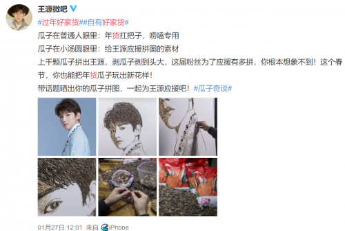 更有一个粉丝团为自己的“爱豆”应援,用上千颗瓜子,无论是带皮的还是剥开的,拼出了人物图的细节和层次感。