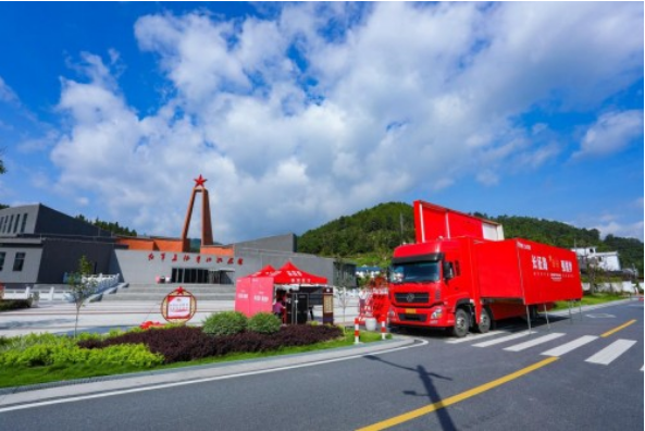 图:停靠在红军长征粤北纪念馆前的党史大篷车
