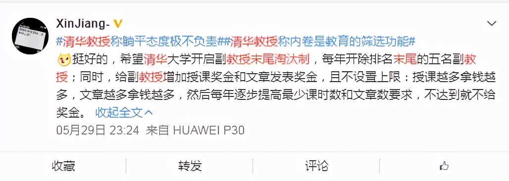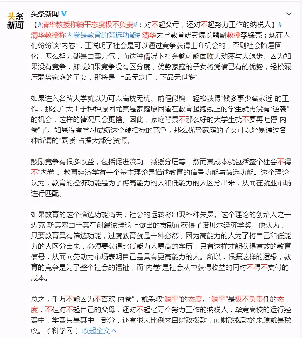 此前,清华一名副教授曾表示躺平态度极不负责,既对不起父母,还对不起努力工作的纳税人。网友也一度怒怼回复,建议清华大学开启副教授末尾淘汰制,每年开除排名末尾的五名副教授。