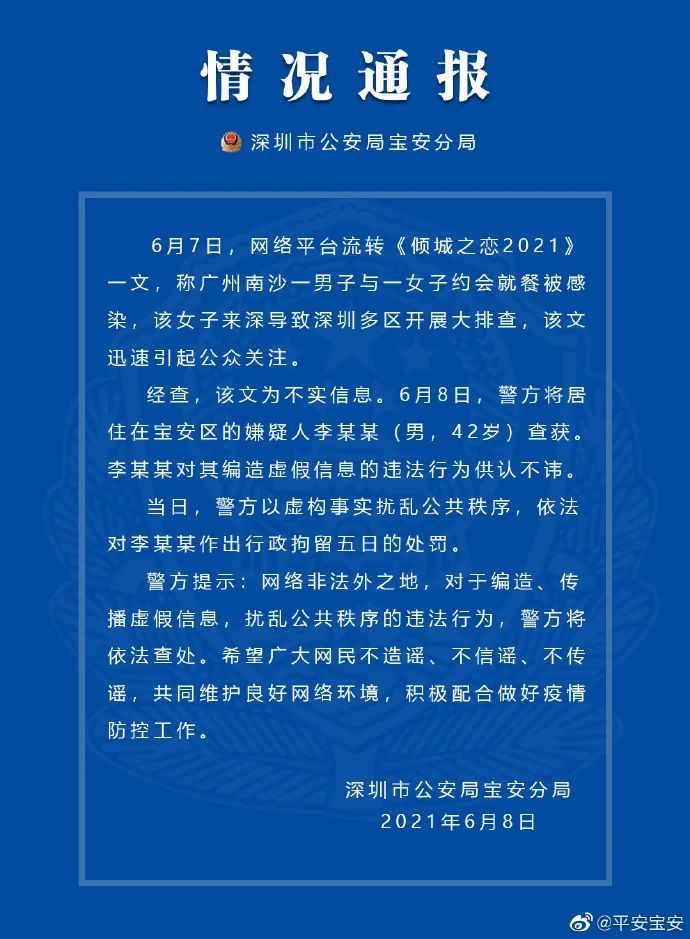 6月7日,网络平台流转《倾城之恋2021》一文,称广州南沙一男子与一女子约会就餐被感染,该女子来深导致深圳多区开展大排查,该文迅速引起公众关注。