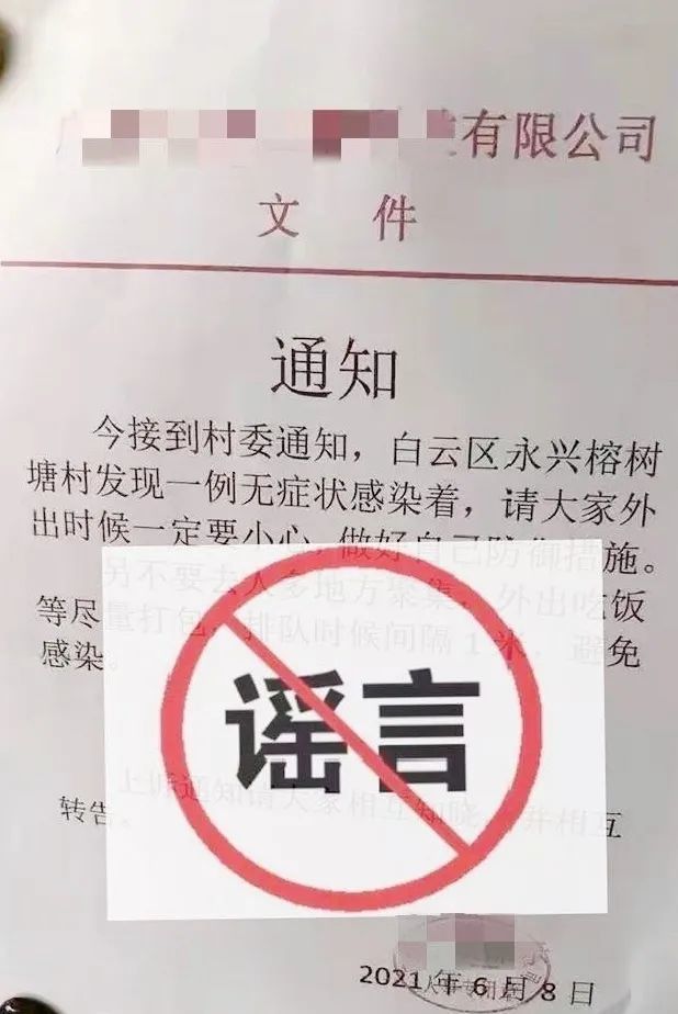 6月8日,白云区龙归街新冠肺炎疫情防控工作办公室发布辟谣通知: