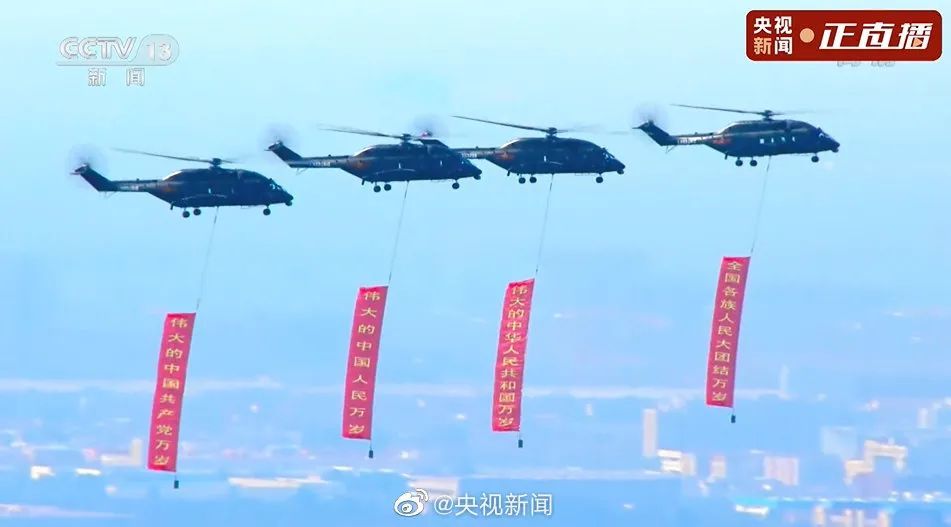 空中护旗梯队悬挂党旗和巨幅标语飞过