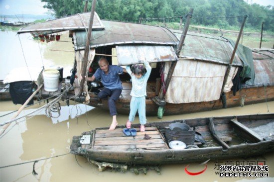 一条破船,这就是家。贫困生阿盈家住在一条简陋的渔船上,见志愿者到来,她和爷爷下船迎接。(本版图片均由东莞时报特派记者 赵浛锐 摄)