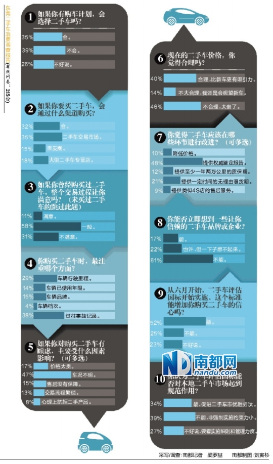 上周,记者针对东莞市民进行了二手车消费意愿调查,结合随机采访及网上投票两种形式,共收到有效调查问卷215份。