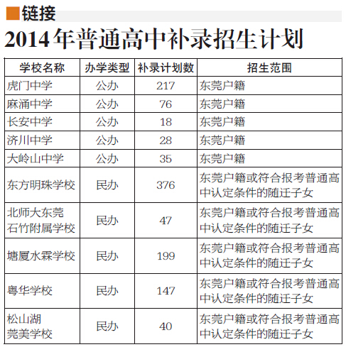 据了解,参加我市公办普通高中补录的考生要求具有东莞户籍,学业考试成绩在550分或以上。参加我市民办高中补录的考生要求具有东莞户籍或符合报考普通高中认定条件的随迁子女,学业考试成绩在530分或以上。此外,不论是参加我市公办还是民办高中补录,都要求信息技术会考科目合格,并且在常规录取阶段未被普通高中以及“中高职连贯培养国际班”、“中高职连贯培养实验班”和中高职三二分段专业录取(已被上述学校录取,但没有按规定时间注册的考生作自动放弃就读普通高中处理,不得再参与补录)。