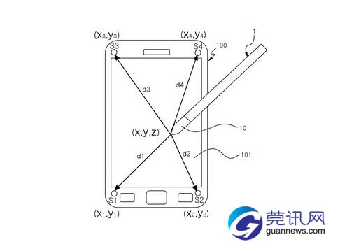 根据专利照片显示,三星手机前面板将设计四个传感器,使用S3传感器定位笔的为二维坐标,S4传感器定位笔的为三维坐标。