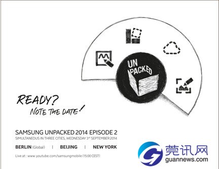 8月6日,三星正式发出了Samsung Unpacked 2014 Episode 2的官方邀请函,这一纸邀请函的曝光让近日来的诸多猜测有了最终定论。无论是“Ready? Note the date!”的标题还是标志性的浮窗预览元素,都预示着GALAXY Note4即将作为本场发布会的主角,在9月3日抢跑IFA,隆重亮相!