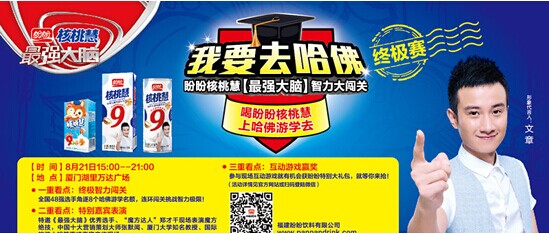 在经历过近三个月、八大省的循环PK后,八月盼盼核桃慧“我要去哈佛”活动终于进入到了巅峰对决的倒计时阶段。据悉,此次巅峰对决将于8月21日,在厦门万达广场举行,届时将同步进行网络直播,让未能在现场的观众也同样可以感受到“我要去哈佛”终极决赛的紧张气氛,和选手们的智慧一刻。