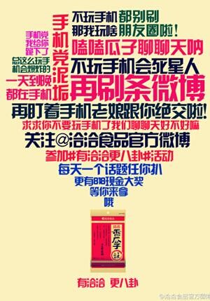 手机,原本是方便人沟通的工具,如今却变成了阻碍沟通的屏障。随处可见的“低头族”、“手机控”,逐渐让整个社会对这一现象感到担忧。近日,网络上流传的“有洽洽更八卦”系列广告,再一次将这一现象推上了热议话题。