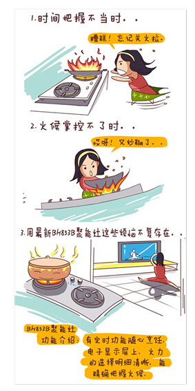 华帝聚能灶BH853B在原来的省气爆炒神器上全新配置了时控显示屏!颠覆传统的时尚设计,只要轻轻一按,一戳,煤气灶也能随心定时,妈妈再也不用担心我做“守厨奴”啦!