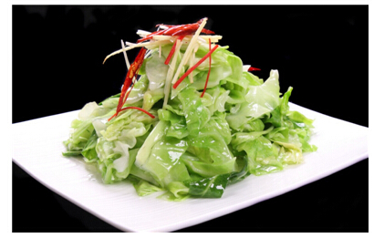 4. “双环大火”,把甘蓝下锅翻炒,滴几滴米醋和盐、加少许美极鲜味汁