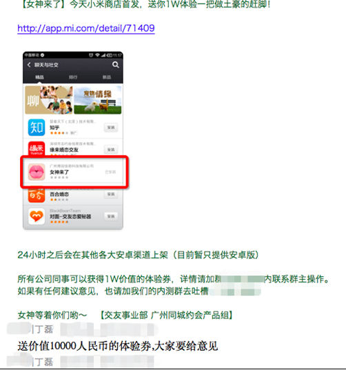 2014年8月29日,网易最新推出的陌生人交友app“女神来了”安卓版正式登陆小米商城,让翘首期盼已久的广大用户一片沸腾。随后,小编收到网易公司内部员工爆料,为庆祝“女神来了”安卓版渠道正式铺开,丁磊大手一挥,决定向网易员工赠送万元“女神来了”体验券,让内部员工尝尝当土豪的滋味。小编做了一下算术,网易大约有5000名男员工,每人一万,那总额不得上千万啊,丁磊才是最大的土豪!消息在网易内部网络传开后,网易员工激动了,纷纷奔走相告下载“女神来了”。
